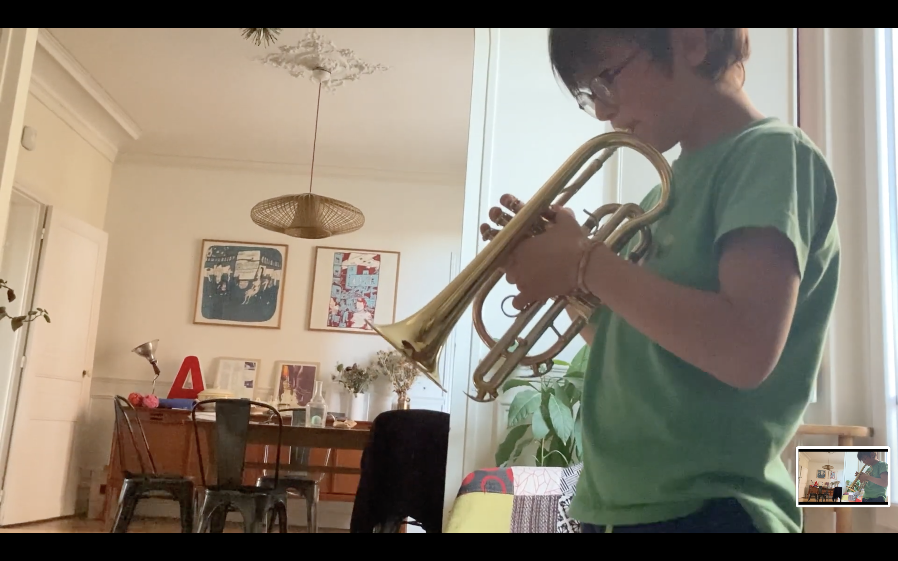 Enregistrement vidéo de mon frère, transposant et jouant "Joyeux Anniversaire" à la trompette.